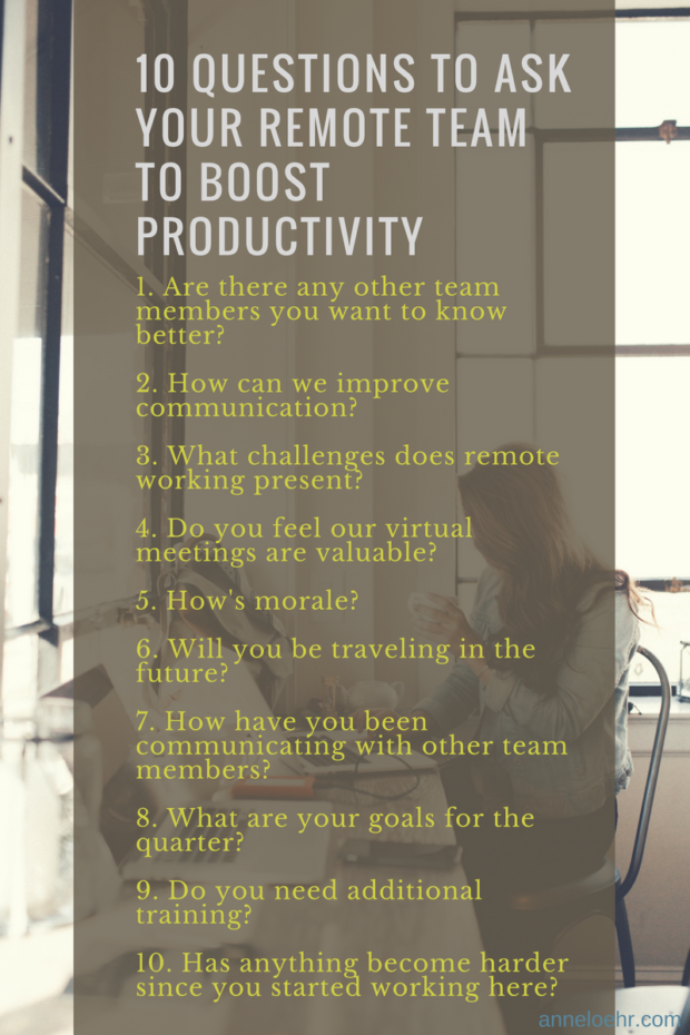 To maintain an organized work culture and enhance productivity – one which keeps employees focused on their work – ask the following questions when you do get the opportunity to communicate with remote employees.