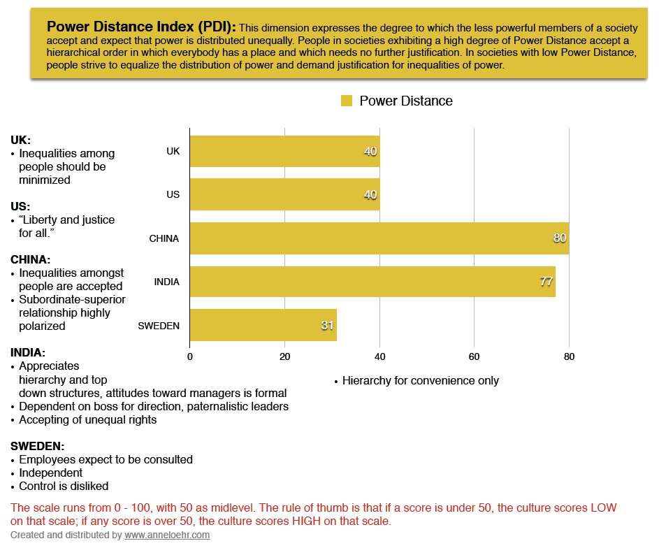 Different cultures were evaluated to determine where they fall on the spectrum, between high and low, of each dimension. Below are the basics of each dimension, and where the United Kingdom, United States, China, India and Sweden fall on the spectrum.