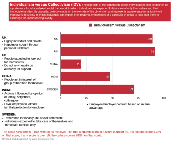 Our chart shows again a similarity between the U.S. (89) and U.K. (91), both scoring high in individualism. People in the U.K. are highly individual and private; happiness is sought through personal fulfillment. In the U.S., people are expected to look out for themselves and not rely heavily on authority for support. China scores the lowest at 20, making them it a more collectivist society where people act in the interest of the group rather than themselves. India is midrange at 48, both individualistic and collectivist. In India, actions are influenced by opinion of family, neighbors and colleagues. They are generally loyal employees and experience almost familial protection from employers. At 71, Sweden is a more individualistic society, where there is a preference for a loosely knit social framework. Swedish individuals are expected to take care of themselves and immediate family, and the employee/employer contract is based on mutual advantage.