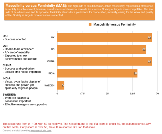 China scored the highest in this category at 87. Chinese culture is pragmatic and able to adapt traditions. They have a strong desire to save and invest, and the truth is not set in stone, but rather dependent on the situation, context and time. India and the U.K. both scored 51, and Sweden scored 53, meaning the dominant preference cannot be determined. The U.S. scored relatively low at 26, where businesses measure performance on a short-term basis with quarterly P&L statements. There is also a strong idea of what is “good” and “evil” in the U.S. culture.