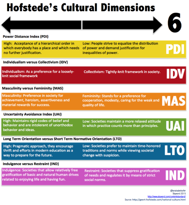 Hofstede says, “It’s important to remember that cultural dimensions don’t exist in real life. They are only a way of understanding a very complex world. They are a framework for making sense of differences. We can use them as long as they are practically meaningful. As such, the dimensions help us understand that what happens in one particular culture does not necessarily happen in another.” Also remember that this theory is about cultural groups and not individuals, who can vary widely from each other despite sharing a culture.