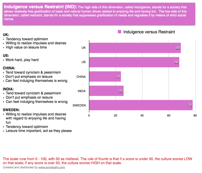 Sweden scored the highest in this dimension at 78, making it a dominantly indulgent culture. They are willing to realize impulses and desires with regard to enjoying life and having fun. They also tend toward optimism, and value leisure time. The U.K. (69) and U.S. (68) scored similarly, indicating a tendency toward indulgence. In the U.S. we like to say, “work hard, play hard, “which is an example of a more indulgent frame of mind. The U.K. tends toward optimism, values leisure time immensely, and is willing to realize impulses and desires. China (24) and India (26) both lean toward restraint, where there is little to no emphasis on leisure.