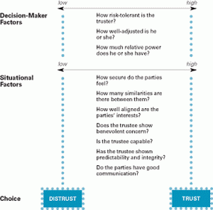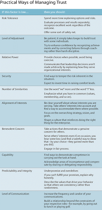 Hurley elaborates on an excellent model of trust that a “trustee” and “truster” can engage in to identify where steps can be taken to develop a foundation for trust and to understand why distrust may exist in their organization. He identifies 10 factors at play, which are paired with practical tips below.
