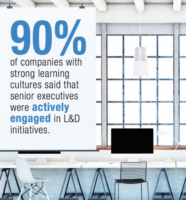 Transforming company culture is not possible without leadership involvement. 90% of companies with strong learning cultures said that senior executives were actively engaged in L&D initiatives. In Finding Courses’ survey of U.S. L&D departments, they found that “the number one comment from professionals about how they encourage a culture of learning is through meaningful and overt support from senior leaders.”