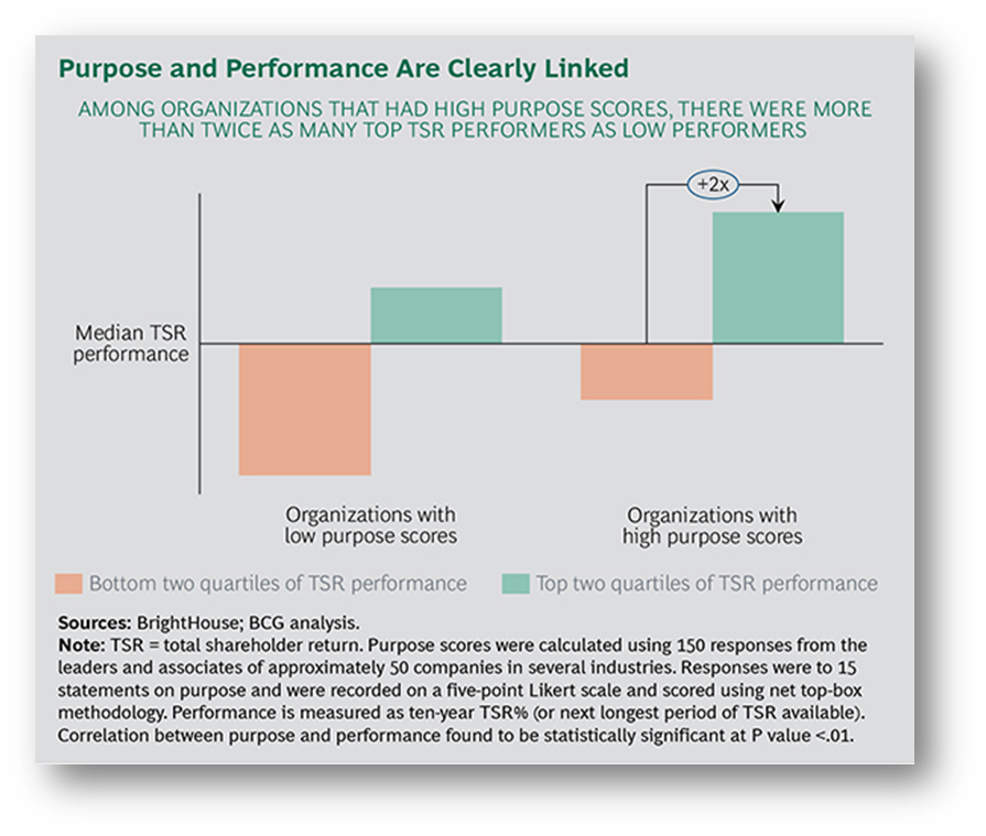The results of this survey were analyzed using measures such as total shareholder return (TSR), revenue, and EBITDA growth. The results showed that when the organizational purpose was truly ingrained, it correlated strongly with ten-year TSR.
