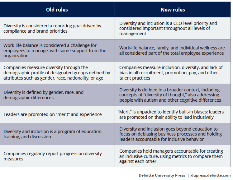 As you can see, the shift in how diversity and inclusion is approached needs to expand. It’s helpful to look at Deloitte’s following table which how D&I was approached in the past, versus how it needs to be approached now.