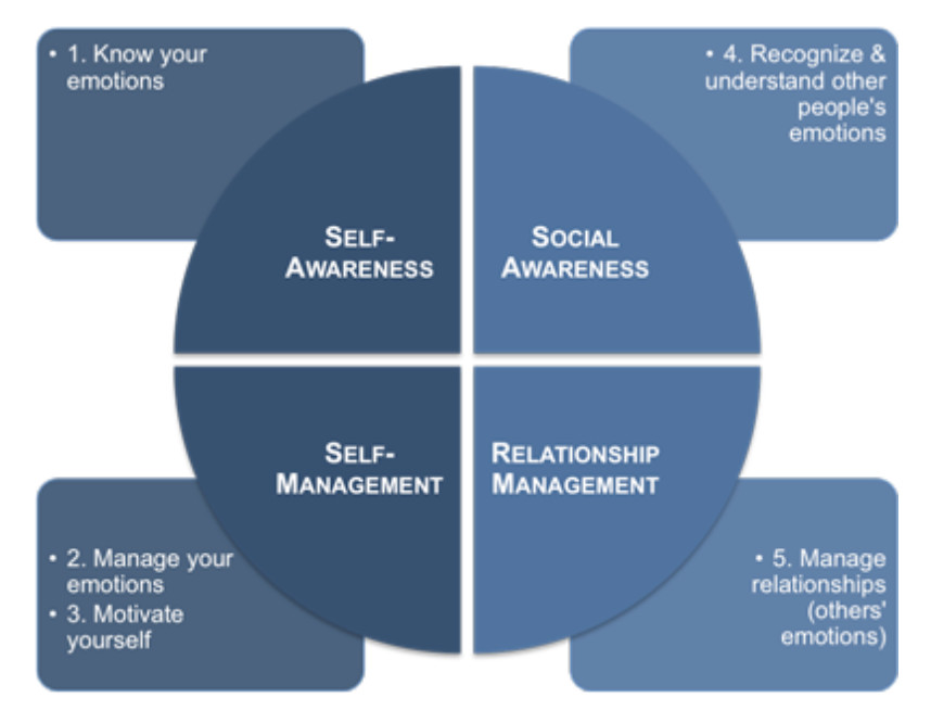 As the sixth component indicates, leadership (LEAD) is needed to support and reinforce planning, recruiting, inspiring, assigning work, and developing the workforce. Effective leadership drives the bottom line, leading to higher profits, lower turnover, and improved results. The actions of senior leaders and direct supervisors have a strong impact on employee engagement. Emotional intelligence (EI) is a critical leadership competency, for both formal and informal leaders. The five domains of Goleman’s EI model have become the de facto standard for applying emotional intelligence in the workplace. The image below represents these five domains in four quadrants: two represent personal competence and two represent social competence.