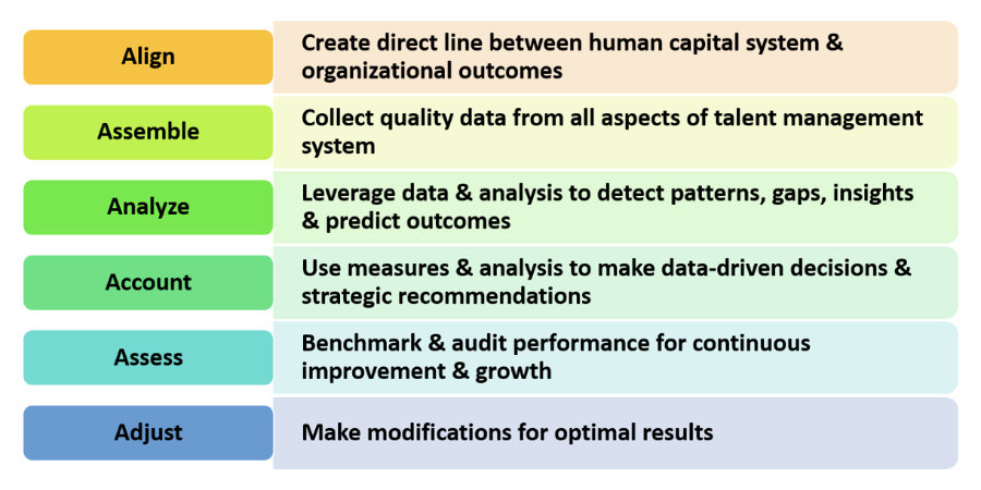 Finally, the MEASURE component provides a tangible linkage to all components in the talent life cycle. Metrics and measurements that are analyzed and communicated provide evidence of the system working effectively as a whole and which components need specific focus and attention. Performance measurement drives continuous improvement. Remembering the “6 A’s” of performance measurement will help you develop and/or refine your system: