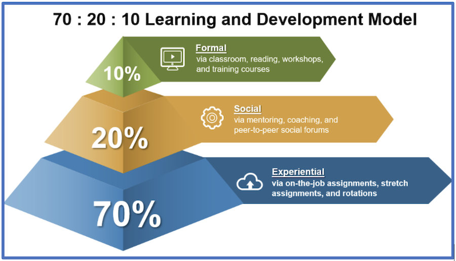 Meaningful workforce development programs have many connections to the rest of the talent life cycle, from mitigating skill gaps in the planning phase to building effective leaders and minimizing employee retention. It is best practice to develop your workforce using the 70/20/10 Adult Learning and Development model, which suggests that employing a combination of the three types of learning approaches, outlined in the image below, will make learning more cohesive and natural.