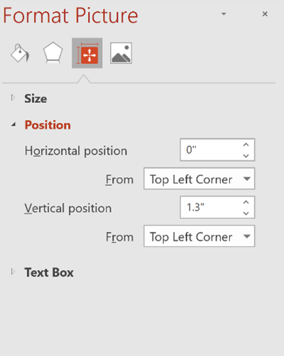 Ensuring that images are formatted with the same dimensions and at the same position across multiple slides is a painstaking task to eyeball. To help, right-click your image – Select Format Picture. Using the size and position inputs on the right-toolbar, you can ensure that all images have the same height, width, X and Y starting position or a seamless transition of images.