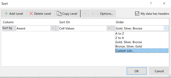 a. Custom List Order. Use a custom list to order your data in a specific fashion that is not alphabetical or numerical. Often for the purpose of presentation and story you want things to appear in the order you want, rather than the alphabetical defaults. To create a custom list, Select Data > Sort > Order > Custom List on the top toolbar. Above we can see an example where a custom list was created to order the rank of ‘Gold’, ‘Silver’ and ‘Bronze’ in order of place rather than alphabetical.