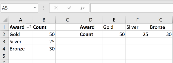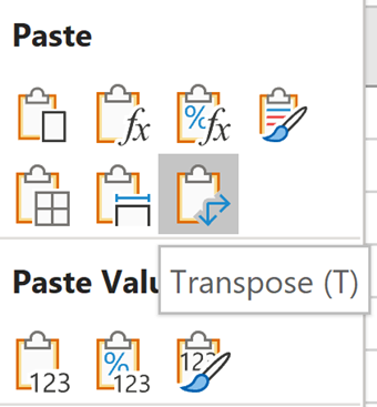 Want to swing your table around for a different view? Easily transpose your column headers to rows using one of the many Paste options. Highlight your table including the headers and copy it to your clipboard. In a blank cell on the same or new sheet, right click > Paste Special > Transpose.