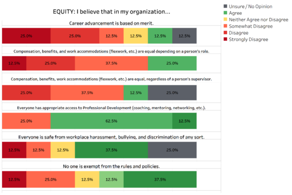 Fundamentally, DEI data analysis will expose the demographic gaps in the above areas to identify where to focus. For example, a DEI survey can show that African American employees feel as though not all employees are treated equally when it comes to compensation, career advancement and following rules. Looking at the below figure, we can see that more than half of African American respondents disagree to some extent about many of the Equity statements.