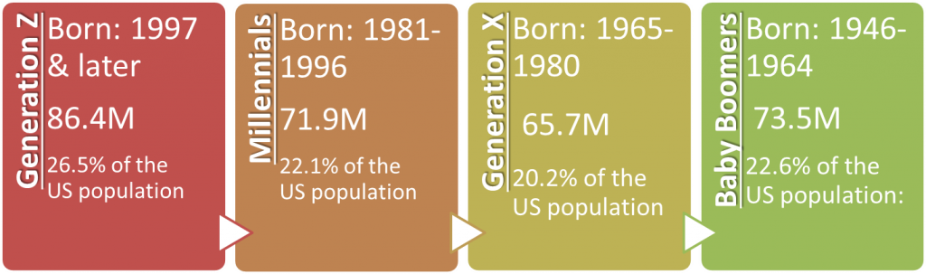 According to Statista, Baby Boomers (born 1946-1964) are 22.6% of the US population, Generation X (born 1965-1980) are 20.2% of the US population, Millennials (born 1981-1996) are 22.1% of the US population and Generation Z (born 1997 and later) are 26.5% of the US population.