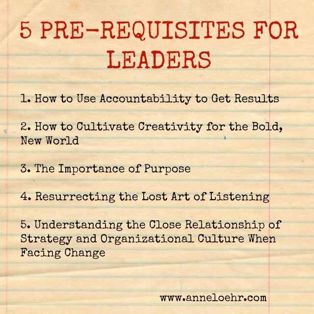 So there you have it—my five pre-requisite courses for leaders cover: accountability, purpose, creativity, listening, and paying close attention to organizational culture during times of change.